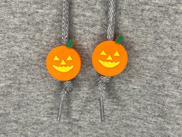 These charms slide onto the drawstrings of your sweatshirt. Pumpkin design with orange and yellow color. One size fits most, may not be able to slide onto larger flat style drawstrings or drawstrings with large plastic stops.